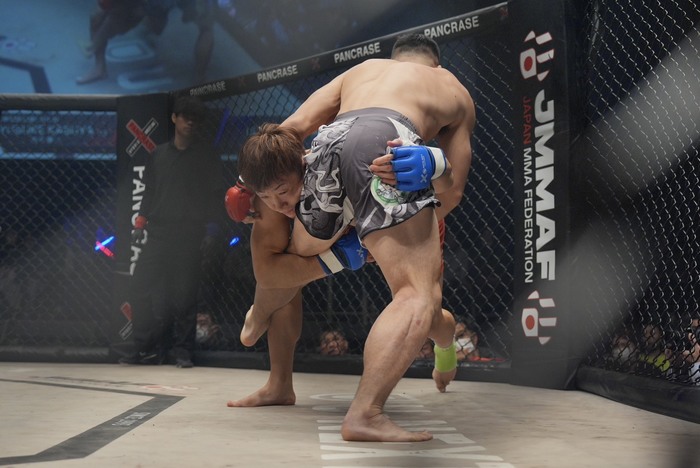 1R、ともにサウスポー構え。ISAOのローに粕谷は前蹴りでバランスを崩し、左ロー。飛び込み組んでシングルレッグのISAOがダブルレッグに切り替えテイクダウン。ケージ背に立つ粕谷。左で差すISAOのヒザがローブローに。