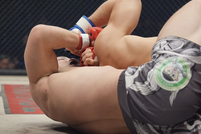 再開、左右からケージに詰めてダブルレッグテイクダウンのISAO。粕谷はクローズドガード。押し込むISAOにパウンド。そのスペースで上体を立てようとする粕谷に手首をコントロールして再び寝かせる。