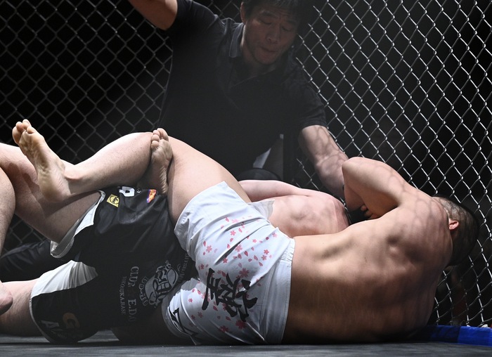 1R、林は山田の奥足のローにジャブを合わせて組んですぐさまバック。ボディトライアングルを組み、リアネイキドチョーク! タップを奪った。