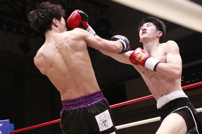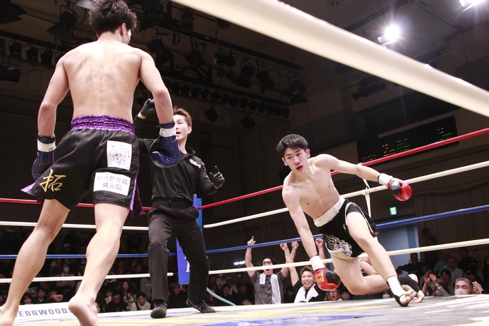 好戦的な両者。オーソドックスの相島は右ミドル、遠藤は左ミドルで激しいミドルの蹴り合い、そして右ストレートと左ストレートを打ち合う。最後は打ち合いで相打ちもある中、相打ち気味に決まった遠藤の右フックで相島がダウン。セコンドからタオルが投入された。