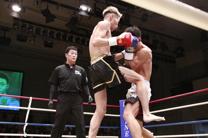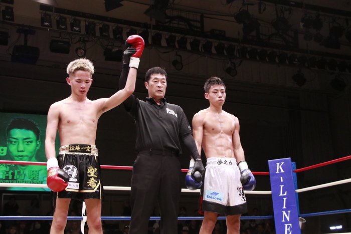 独特な待ちの構えからヒザ、ジャブ、ワンツーを打つ松延は変則的なカーフを蹴っていく。宮島はクリンチが多く、痛いレッド―カード2枚。松延はローブローで嗚咽するほどだったが最後まで戦い抜き、判定勝ち。