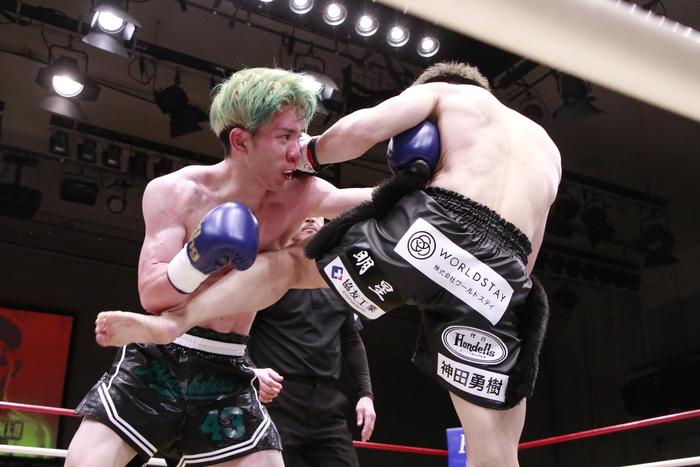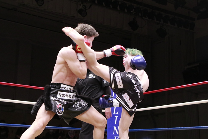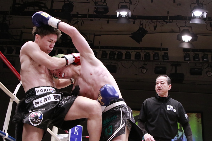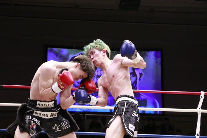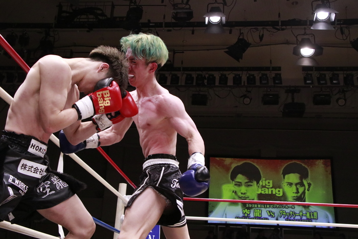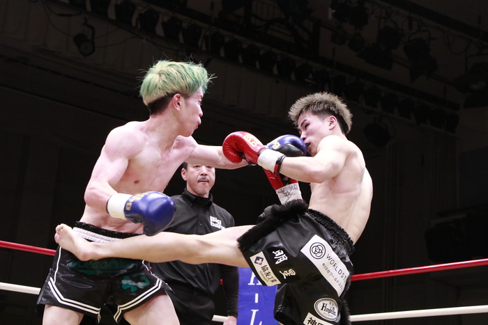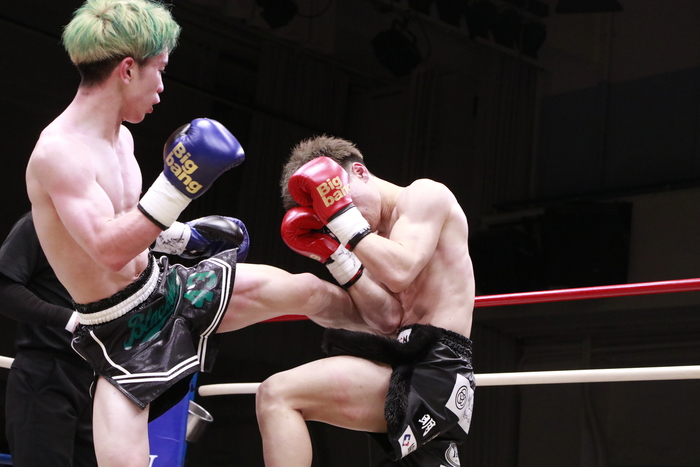 1R、勢いよくパンチで攻め込む颯太朗に空龍は蹴りで対抗。颯太朗が左ボディを打てばヒザ、ワンツーには左ミドル。インファイトしてくる颯太朗を抱え込んでしまう空龍はホールディングで痛いレッドカード(減点1)。そこからはプッシュしての左ミドル、ヒザが決まる。
