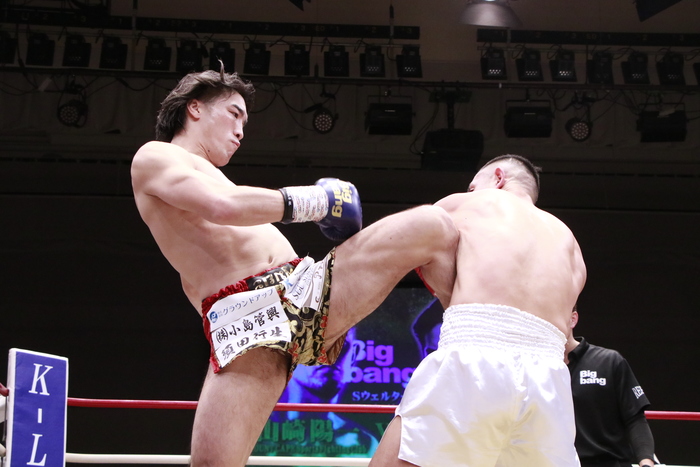 3R、前へ出る山崎が右ストレート、左フックをヒットさせるが、FUMIYAは得意の左ミドルで反撃。右ハイキック、右ローと蹴りを多用するFUMIYA。最後は右ローを連打。