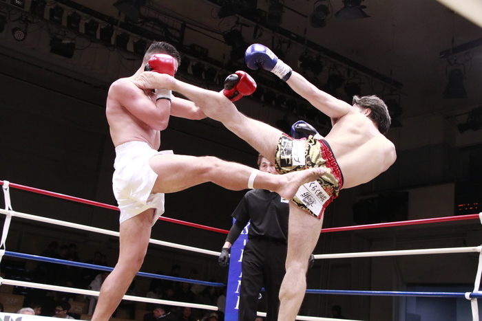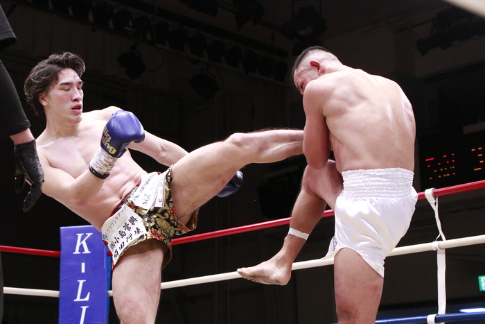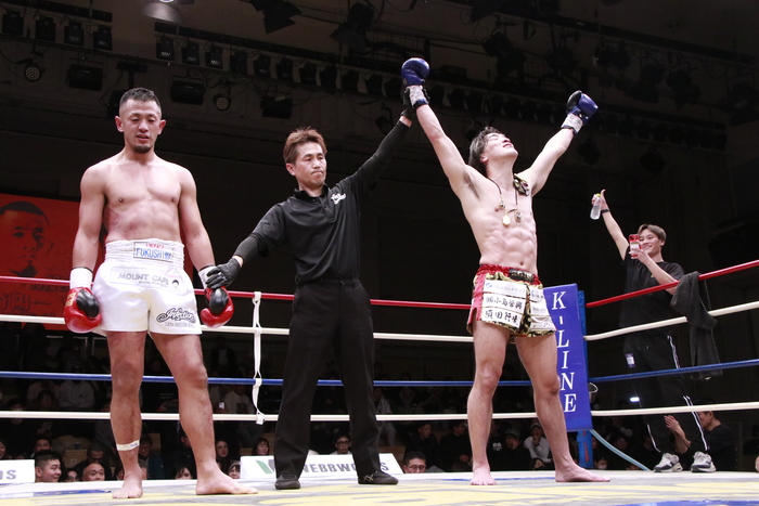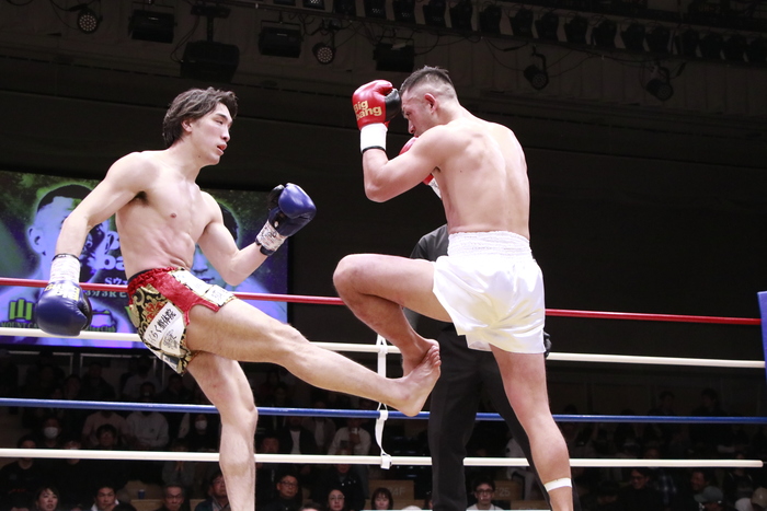 2R、FUMIYAは徹底した右ローと右カーフで山崎を追い詰めるが、山崎も左右フックにアッパーを織り交ぜて応戦。前に出るFUMIYAが山崎をコーナーへ詰めて攻勢を続ける。山崎も左右ロー。