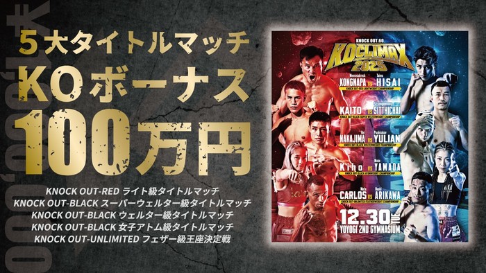 2025年12月30日(火)東京・国立代々木競技場第二体育館『MAROOMS presents KNOCK OUT.60 ~K.O.CLIMAX 2025~』(U-NEXT配信)の大会賞金総額が、1400万円に決定した。