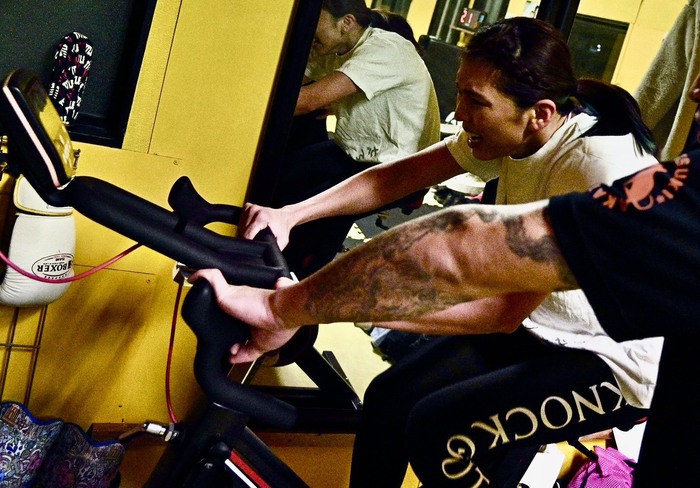 かなりキツいインドアバイクのトレーニングを見せたぱんちゃん(C)KNOCK OUT