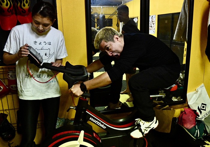 この日の公開練習ではミット打ちではなく、世界中のトップアスリートが使用している「インドアバイク」を使用した練習を公開。