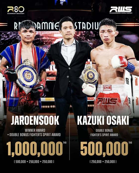 両者にはファイティングスピリットを見せつけるアツい試合をした選手に贈られる250,000バーツ(約125万円)×2のダブルボーナスが贈られた。