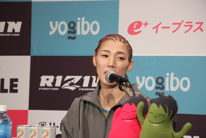 第10試合のRIZINスーパーアトム級(49.0kg)タイトルマッチ5分3Rで、RENA(SHOOTBOXING/シーザージム)の挑戦を受ける王者・伊澤星花(Roys GYM/JAPAN TOP TEAM)が出席。試合への意気込みを語った。
