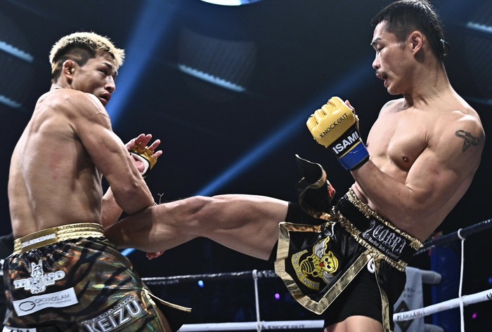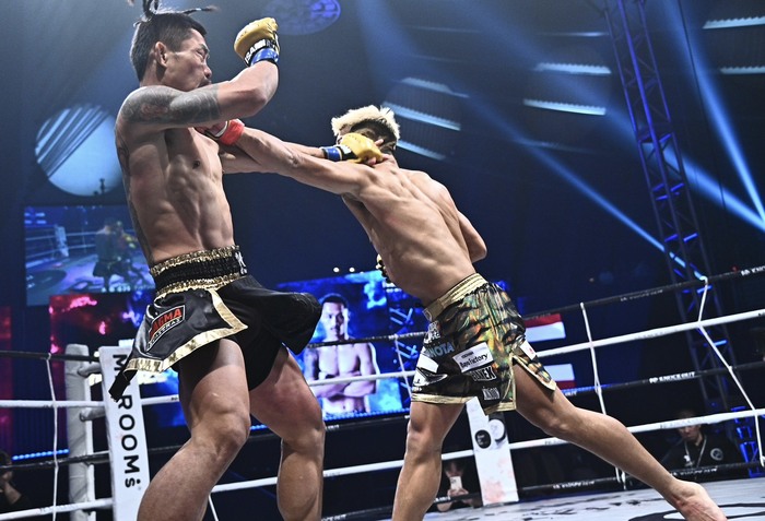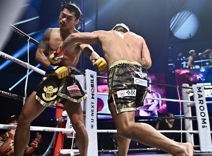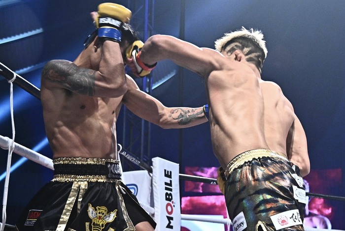 1R、前に出ていくのはサウスポーの大雅。左右ローを蹴っていき、プンルアンは右ミドル。大雅が左ストレート、プンルアンは右ミドルをしっかり当てていく。大雅は飛び込んでの右フック、左ストレートで大きくプンルアンが後退する。