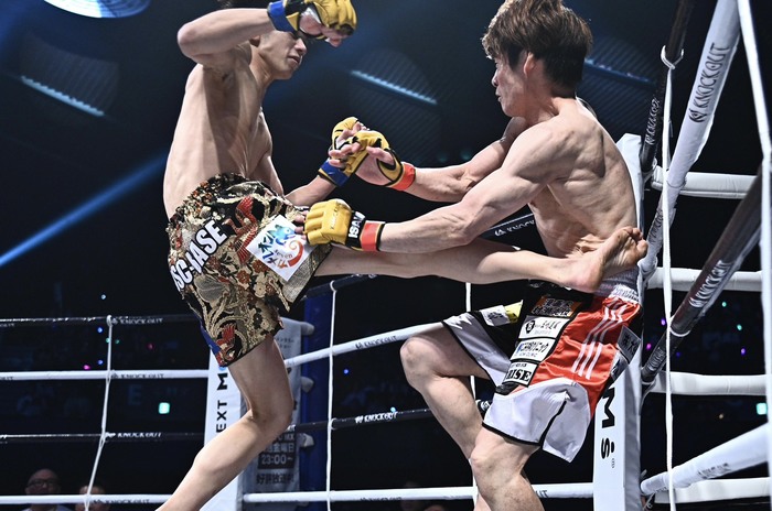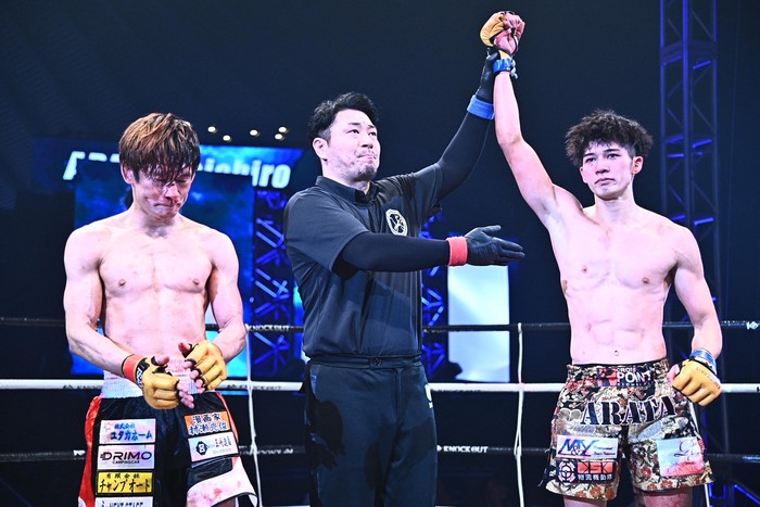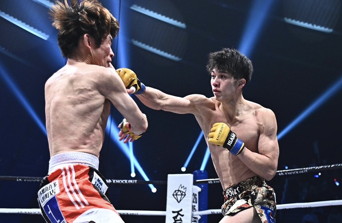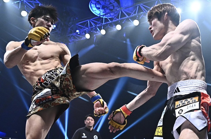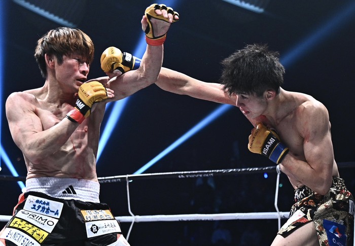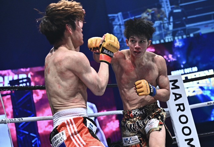 2R、新田はジャブを当てていくが、町田が右ストレートを強打。すぐに新田も打ち返しに行くが、またも町田の右がヒット。新田はテイクダウンに行ったがブレイク。右ストレートを同時に出し、返しの左フックを当てるのは新田。