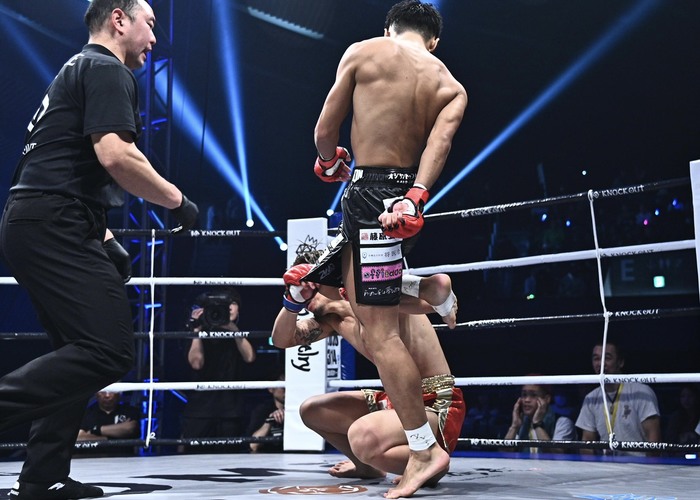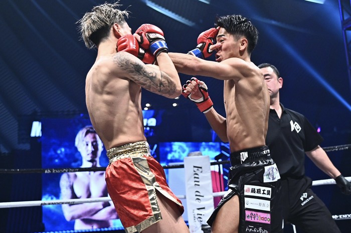 1R、迅に蹴り足をキャッチされた皆川は回転蹴りを放ったが、空振りして転倒。そこへ迅が顔面へヒザを見舞ってしまいレッドカードに。再開後、前へ出てワンツーと左右ローを出す皆川だがややフラつき気味。迅は右カーフを蹴る。