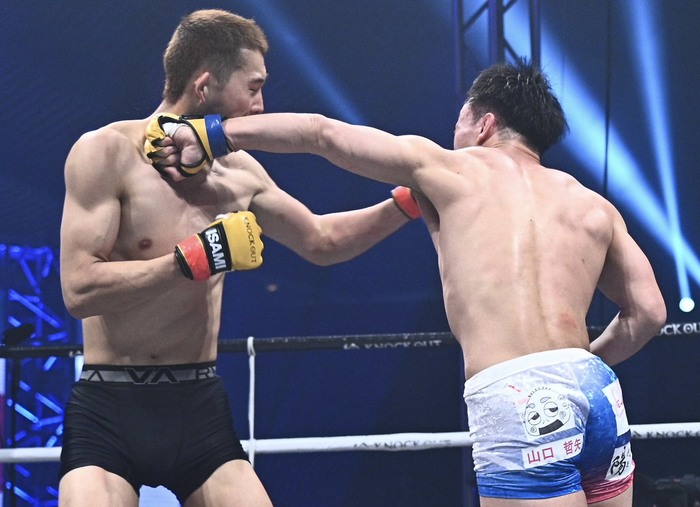右ストレートで前に出る中村にふくやーまんがシングルレッグ。中村はヒザで対抗。ふくやーまんの飛び込んでの左フックに中村は右フックを打つ。