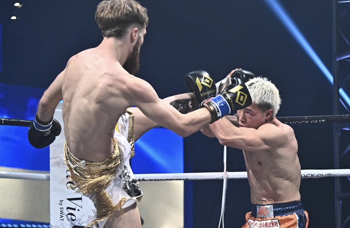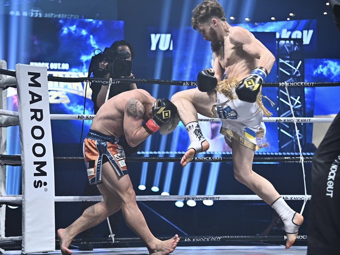 1R、ポズドニアコフが飛びヒザ蹴りの奇襲。中島は回り込んで右カーフ。ポズドニアコフがテンカオ2連発から一気に前へ出て左ボディ、左ミドルを連打。中島はダウンを喫する。