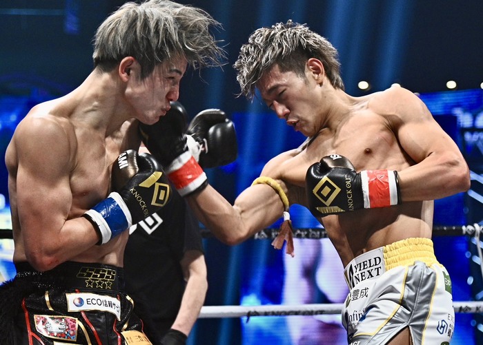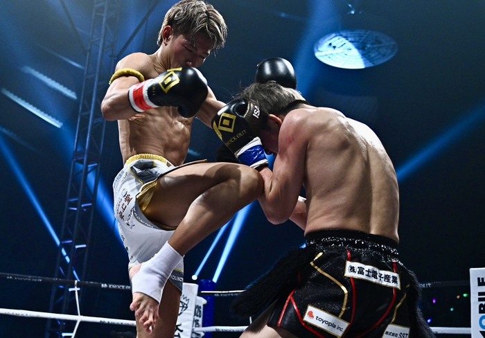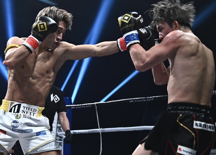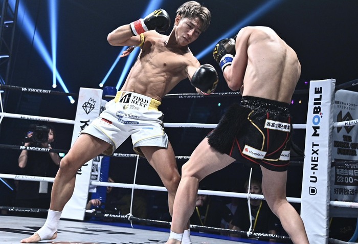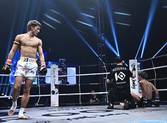 玖村の右ストレートにはすぐに右を打ち返し、ヒザも突き刺す。玖村がワンツーを打ってきたところに右ハイキックでダウンを奪う。立ち上がった玖村をロープ際へ詰めていった龍聖はヒザ蹴りから再び右ハイキック。玖村がロープにもたれかかったところでレフェリーがストップした。