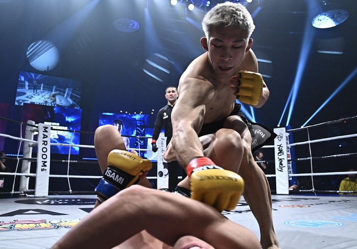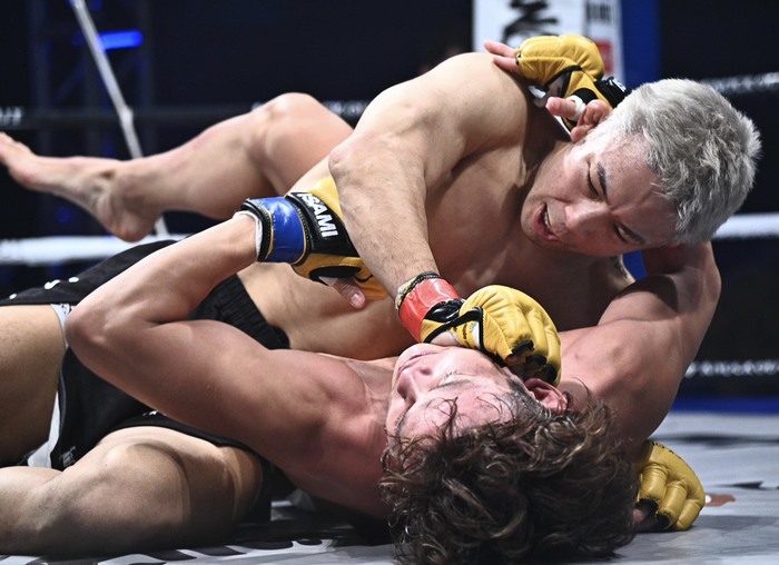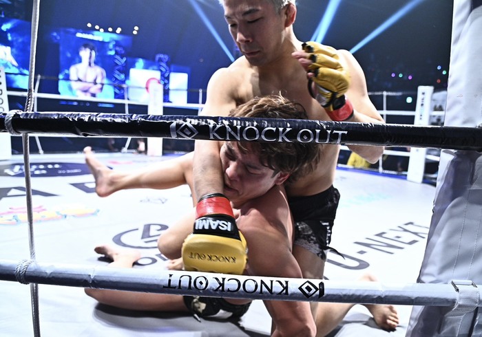 1R、松嶋がさっそくシングルレッグからテイクダウンし、パウンドを見舞う。ブレイク後もすぐに松嶋がニータップからテイクダウン、パウンドとヒジ。次はダブルレッグからマウンドを奪ってヒジの連打。その後もテイクダウンを奪ってはパウンドやヒジで圧倒する松嶋。