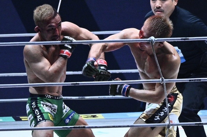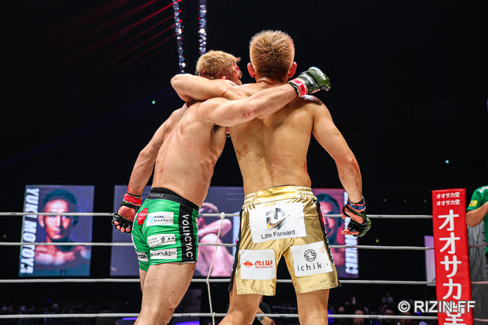 扇久保は左ボディから詰めて右、元谷も左を返すが、扇久保もアゴを引いて受けて右を返す、互いに退かない打ち合いでゴング。両者抱き合う。