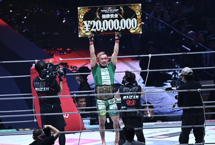 ベルトを腰に巻くと「皆さん、やっとチャンピオンになれました。いま本当に幸せです。ありがとうございます。言葉にならないくらい嬉しいです。本当に元谷選手、最後まで気持ち強くて決勝で元谷選手とベルトを懸けて戦えてよかったです。元谷選手、ありがとうございました。選挙で僕落ちちゃうのかなと思ったんですけれど、強い気持ちをもってここまで戦ってきて本当に良かったです。(妻へ)どん底の時もありました。もうダメなのかなと思った時もありました。でも、一番側でずっと支えてくれた奥さんの京香さん、本当にありがとう。心から愛しています。フライ級のチャンピオンとしてこれからフライ級盛り上げていくので皆さん、よろしくお願いします。ありがとうございました」と、勝利者インタビューに答えた。