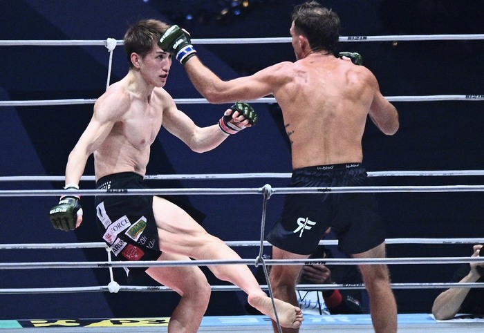 1R、ともにオーソドックス構えじりじり圧力をかける井上は右の蹴り。サバテロの左ローの打ち終わりにカーフを効かせてバランスを崩す。ダブルレッグテイクダウンのサバテロ。井上の立ち際にバッククリンチから引き込み左足をかける。立つ井上にボディロックテイクダウン! 向き直りの井上に肩固めを狙うが、井上は胸を合わせてトップに。