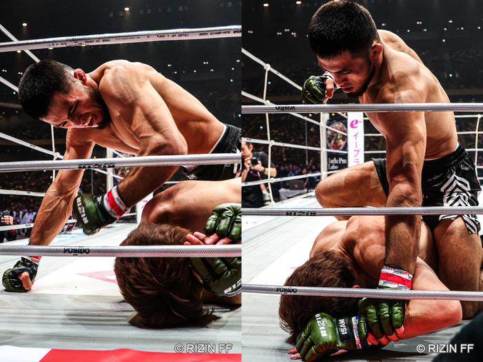 再び朝倉の身体を両足で伸ばしたシェイドゥラエフの左右の強打、33発目でレフェリーが間に入った。