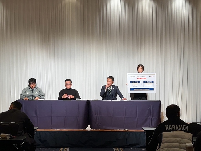 『デュアルマストシステム』も、考えに考え抜いてですね、チャレンジをしてみようと。みんなが本当に一本・KOを狙いに行く。ポイントゲームじゃなくて、ユニファイド(ルール)のいいところ(と悪いところ)──ラウンド毎に(判定を)取っていくなかで、1、2ラウンドを取っていたら3ラウンド目の戦い方が変わりますよね。2ラウンド取ってるなって思っても、3ラウンド目は流さずに取りに行かなくちゃいけないっていう意識になってもらうこととか。これがしっくりいくのかどうかも検証しながらですけど、でもかなり考えて新しい新システムを2026年3月(の開幕戦)から導入して、選手たちともしっかりルールミーティングを重ねて、マスコミの皆さんにもより理解していただけるような資料も作って、啓蒙させていただくし、試行錯誤していきたいと、そういう風に思っています」