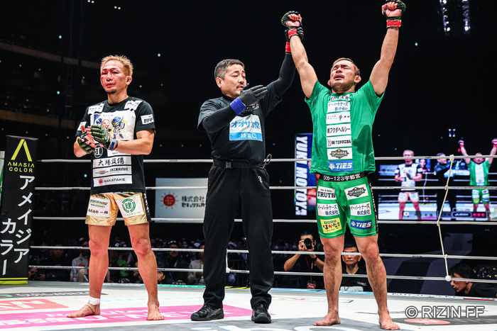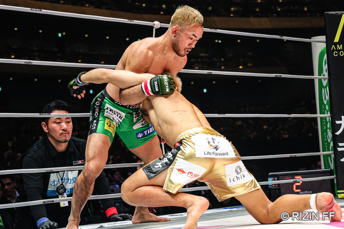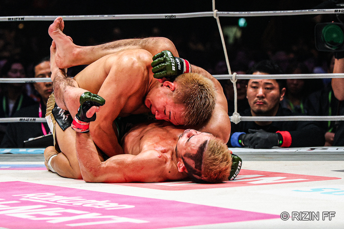 2025年12月31日(水)さいたまスーパーアリーナで開催された『RIZIN師走の超強者祭り』にて、第13試合のRIZINフライ級(57.0kg)選手権試合(フライ級GP決勝)5分3Rで対戦した扇久保博正(THE BLACKBELT JAPAN)と元谷友貴(アメリカントップチーム)。