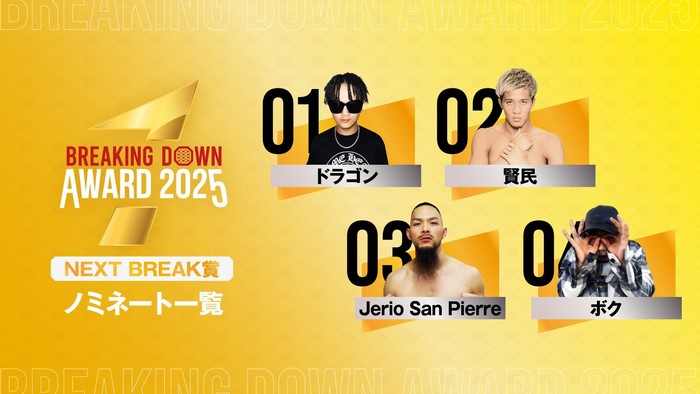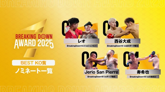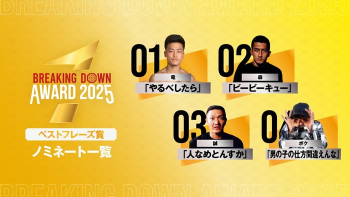 BreakingDownが2023年から行っている年間表彰式『BreakingDown Award 2025』のノミネート選手が発表された。