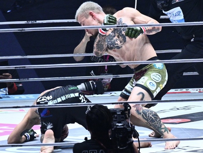 「いや、テイクダウンされへんなって思いましたね、1回組み合ったときに。両差しで崩して逆に僕がテイク取ったと思うのですけど、“組みできひん”って思われがちなんですけどそんなことなくて、練習ではガンガン組むし、ガンガン極めるし。試合で提供したいのはああいう殴り合いっていう、ヒリヒリなんで。僕が試合でやることは決めてるけど、普段は組みも寝技もめちゃくちゃやっているので。そうですね、見せるものを試合前はいろいろ断捨離して、よりシンプルにヒリヒリにこだわってやらしてもらってます」