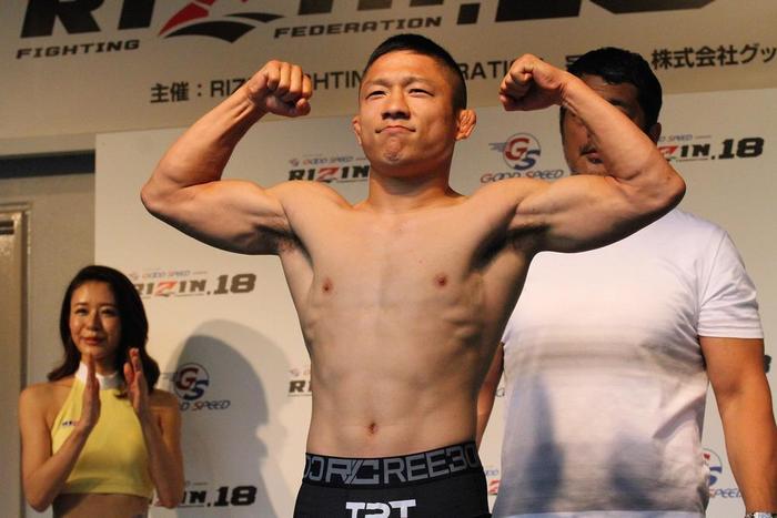 【写真】RIZINガール時代、堀口恭司の計量パスに拍手する寺地。堀口夫人の川村那月とはRIZINガールで同期だった