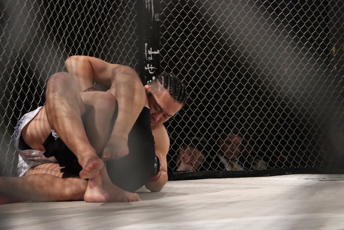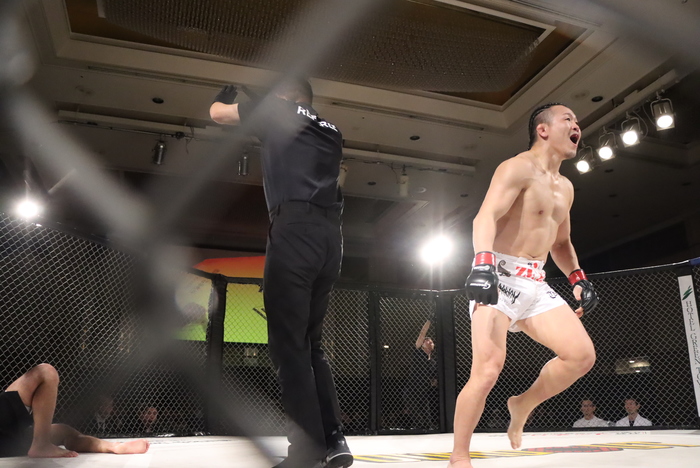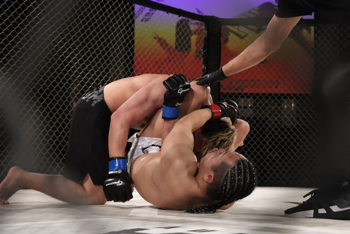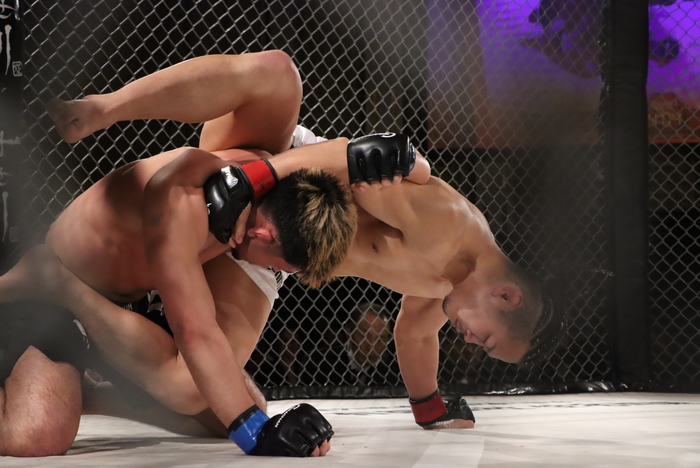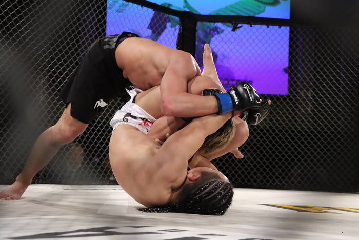 1R、岡田の右ローがローブローとなり中断、再開。石橋はボディロックテイクダウンからバック狙いも落とした岡田。下の石橋は三角絞めから足を組み直してタップを奪った。
