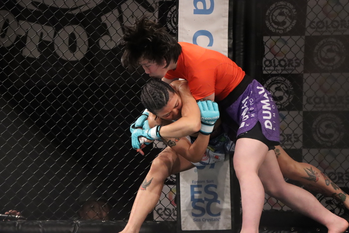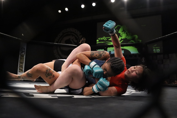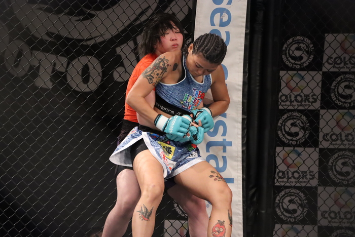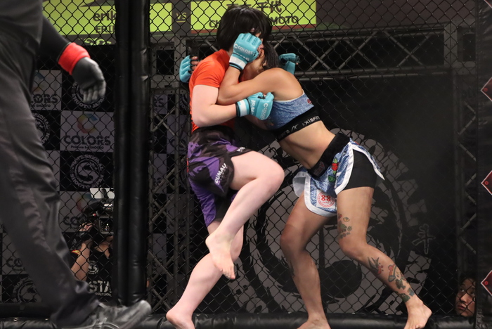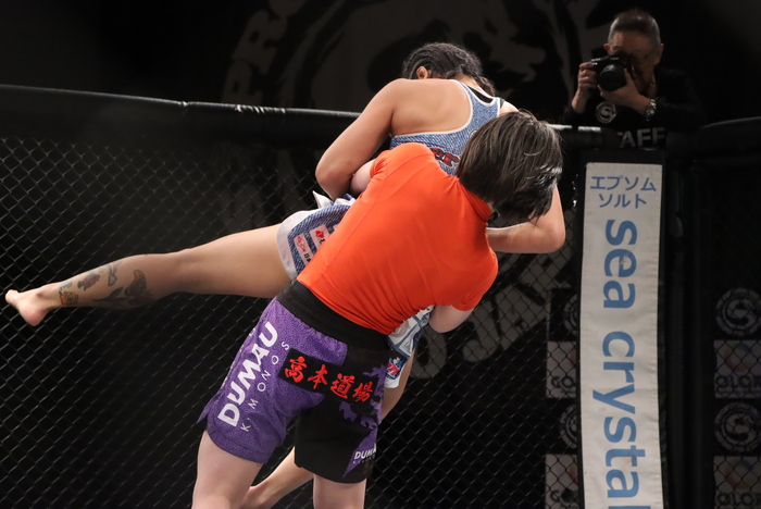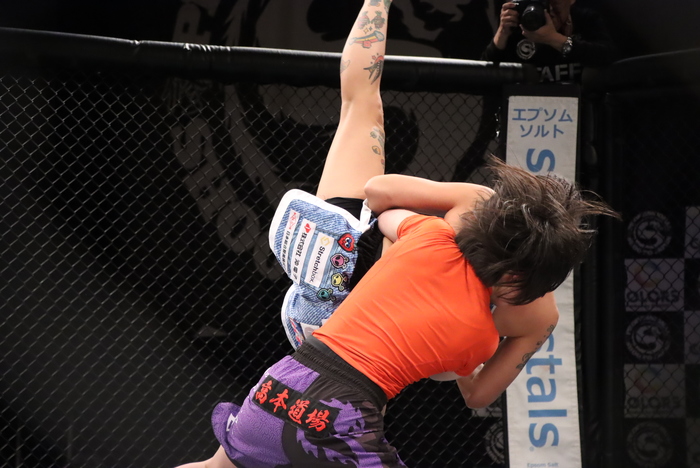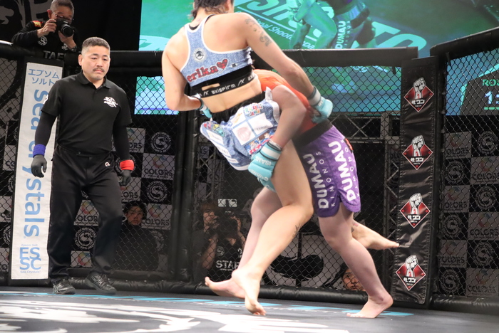 しかし高本はすぐにダブルレッグに入りテイクダウン。ボディロックパスでサイドに出ると再びバックにつく。残り1分。バックから殴る高本。erikaが正対しマウントになると、高本は腕十字へ。クラッチは外れたが、極めるには至らず1R終了のホーンが鳴った。