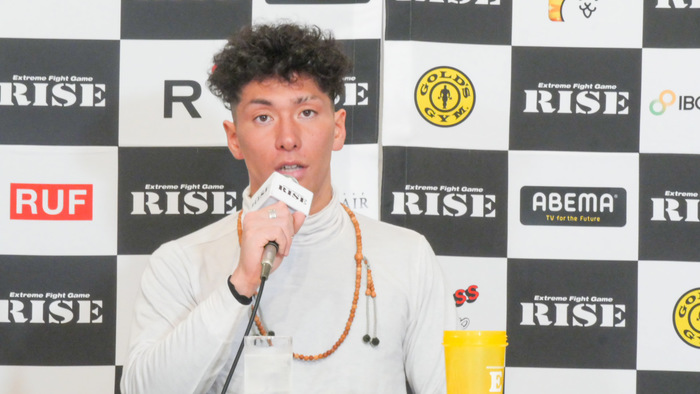 「計量に遅れてしまって申し訳ないです。今回がRISE初参戦なんですがこのトーナメントに選んで頂いてありがとうございます。明日はピエロクラブらしく、前回のCKCではピエロらしさが出せてなかったので今回は(山口)裕人君に怒られない様にガンガン前に出ようと思います。対戦相手の琉樺君はめっちゃ若いんですけど『神童の再来』とか言われてて逆に美味しいかなって思っているので。明日はよろしくね」