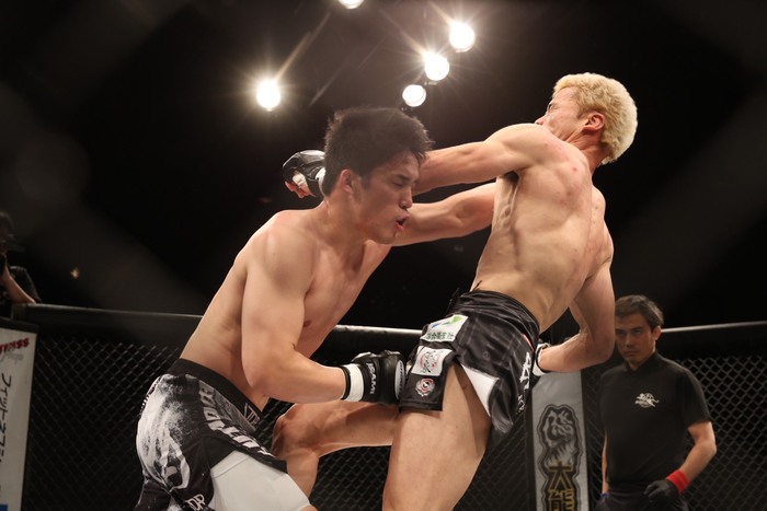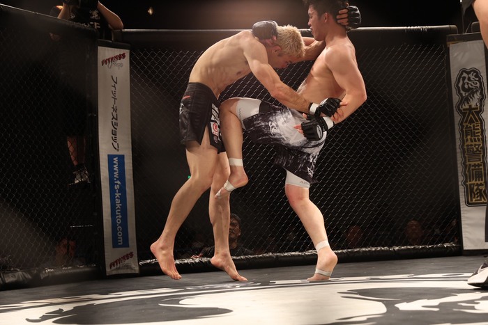 1R、サウスポーの石原に築地はオーソドックス。間合いを詰める築地。パンチを打ち込みケージに押し込む。入れ替えた石原。右ヒジを振った築地。離れた。石原がタックルを狙ったが、首相撲に捕らえた築地が右のヒジを連続で放つ。石原がタックルで組み付きボディロックに。後方に倒してテイクダウンした石原。ハーフ。押さえ込む石原に対し、下から掌底で叩く築地。ガードの中に入った石原だが、築地は下から頭部にヒジを入れる。密着したままパウンドを入れる石原。残りわずかで石原の足をかついでサイドに出ながらパウンドを落とした石原。ガードに戻す築地になおもパウンドを落としていく。1R終了。