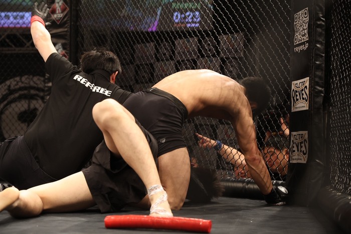バックから投げてテイクダウン。パウンドを打ち込んでくる吉村を足で阻もうとするが、吉村はパスしてマウント!背中を向けた土橋にバックマウントからパウンドを打ち込むとレフェリーストップ!