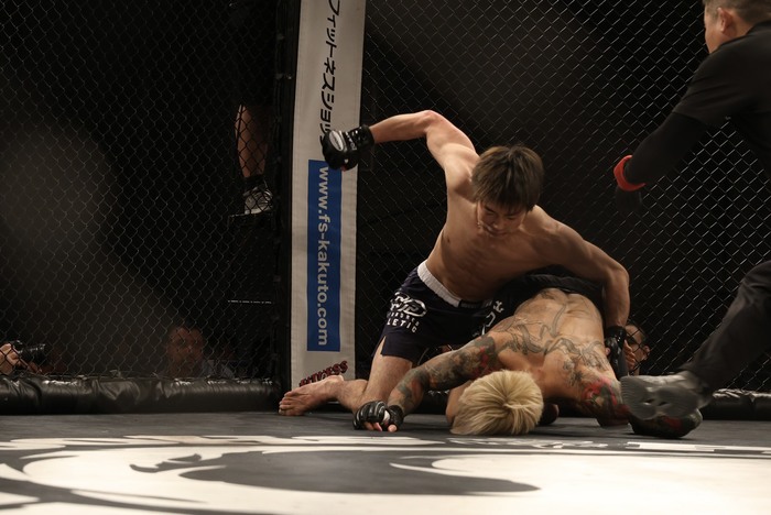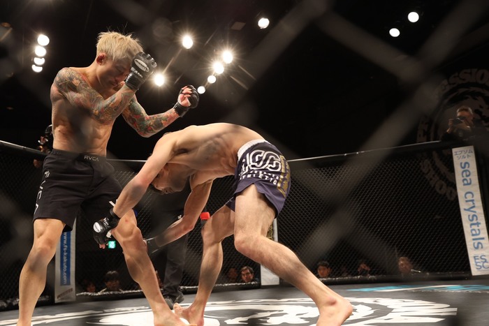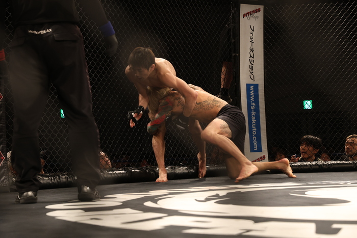 笹は軸足を刈って崩すとスタンドバックについた。バッククリンチでグラウンドに引き込もうとする笹だが、藤井はこらえながら背中の笹にパンチを入れる。笹がバッククリンチのまま腰を落として引き込んだ。両足をフックした笹。反転しようとする藤井のバックについている。1R終了。