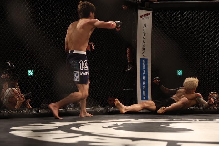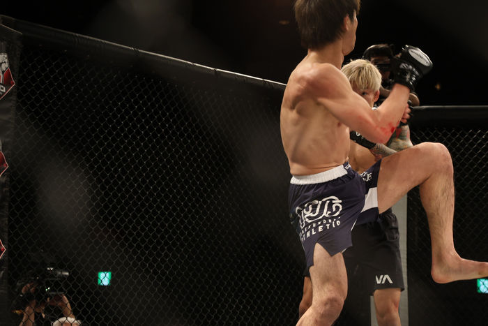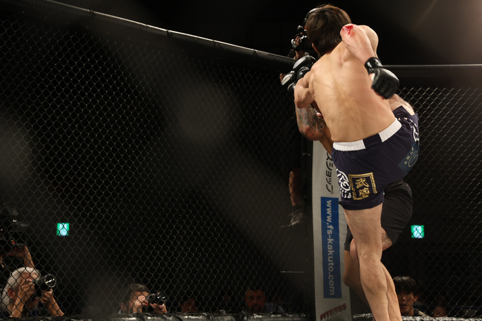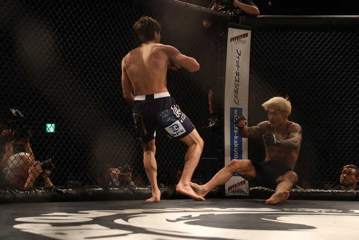 バックから足をフックしてグラウンドに持ち込もうとするが、動きがなくレフェリーからブレイクがかかる。藤井がボディから右ハイキックを放つと、さらにもう一回転してハイキック。そこから右の跳びヒザ! クリーンヒットし、笹が後方にダウン!