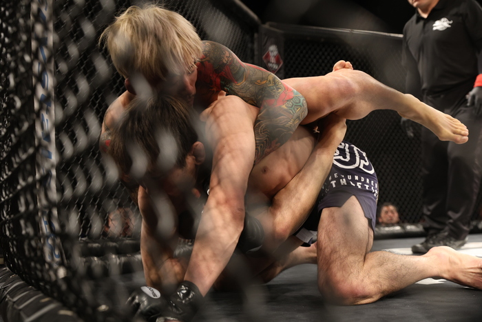 2R、パンチで出る藤井。笹は藤井の足をキャッチしてシングルレッグに。ダブルレッグに切り替えて尻もちをつかせるが、藤井はケージを使って立った。藤井が投げてテイクダウンすると引き剥がしてパウンドを入れる。立った笹に、今度は藤井がタックルに入る。シングルレッグ。笹は首を抱えるとがぶりの体勢に。離れた。またシングルレッグに入った笹。また笹がスタンドバックの体勢に。