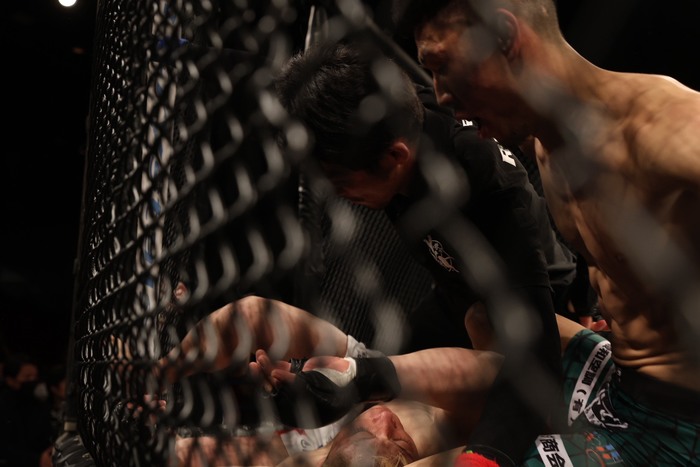 2R、間合いを詰める大竹。柴山はケージ際をサークリングする。インロー、ミドルを蹴る大竹。さらに左フックをヒット。ワンツーを入れる。柴山が出ると、すぐにバックステップする大竹。柴山がタックルに入る。切った大竹だが、柴山はパンチで追撃して出ていく。ケージに詰めたが、大竹のカウンターの左がヒットし、柴山ダウン!パウンド! KO!