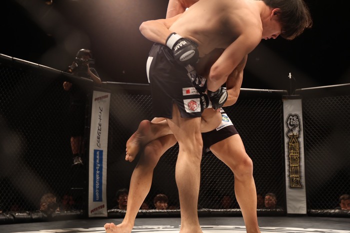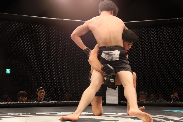 1R、両者オーソドックス。タックルを見せる飯野。辻がパンチで出るが、飯野がタックルに入るとボディロックからバックに回る。後方に引き込みながら四の字ロックに捕らえた。リアネイキドチョークへ。耐えていた辻だが落ちた!