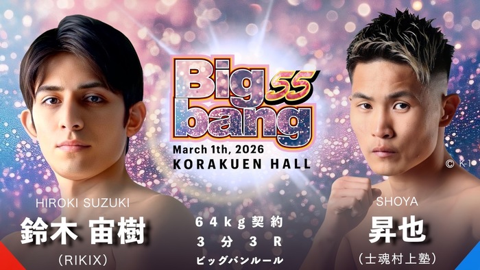 元RIZINフェザー級王者・鈴木千裕の兄である鈴木宙樹(RIKIX)が、ビッグバン初参戦をはたすこととなった。鈴木宙樹は第2代REBELS 60kg級王者で、23年6月にはRIZINで梅野源治を飛びヒザ蹴りでKO。25年11月にはRISE初参戦で山口裕人からダウンを奪い、判定勝ちを収めている。