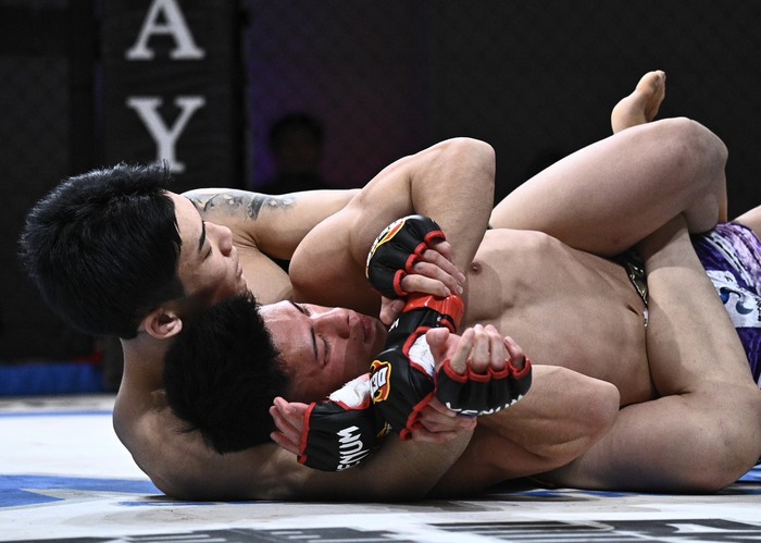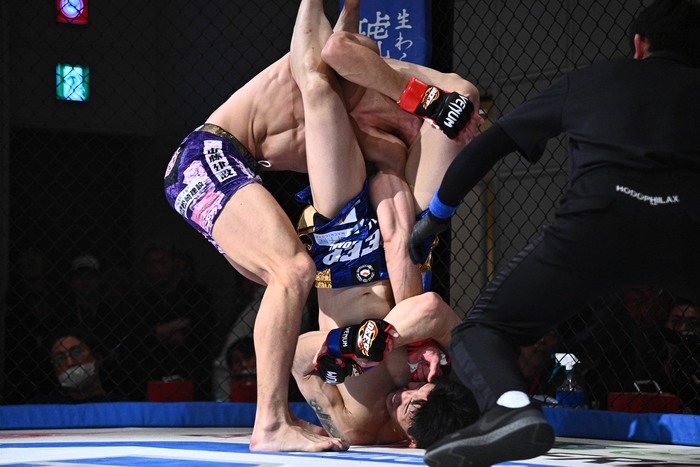 足を組んだ側に回る佐々木にツイスター、さらに脇に挟んでスコテッシュツイスターを狙うダイヤ。外した佐々木がトップに。50/50から足関節もヒザを抜いたダイヤが上に。バックマウントからパウンドでゴング。