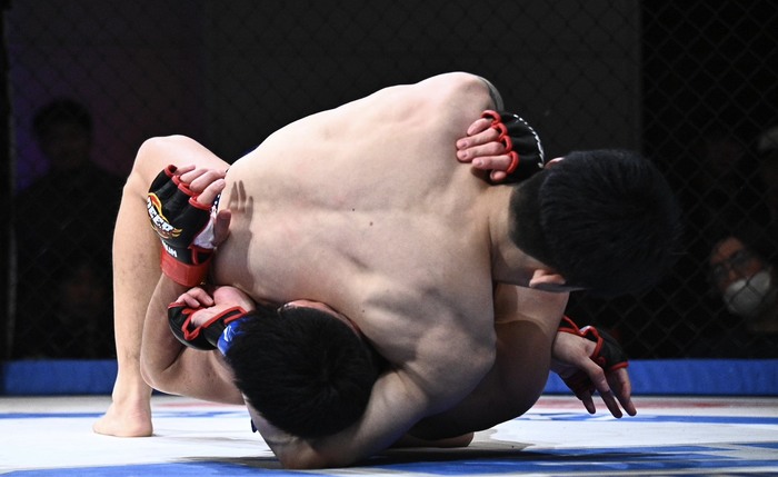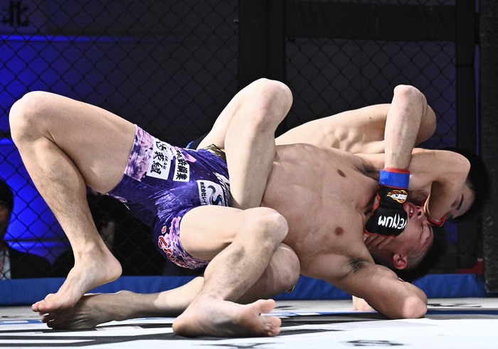 足を組んだ側に回る佐々木にツイスター、さらに脇に挟んでスコテッシュツイスターを狙うダイヤ。外した佐々木がトップに。50/50から足関節もヒザを抜いたダイヤが上に。バックマウントからパウンドでゴング。
