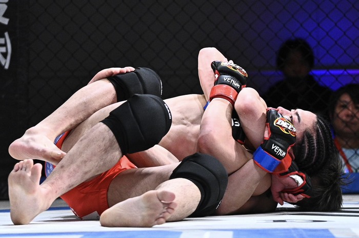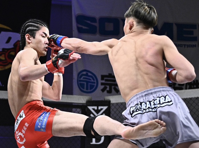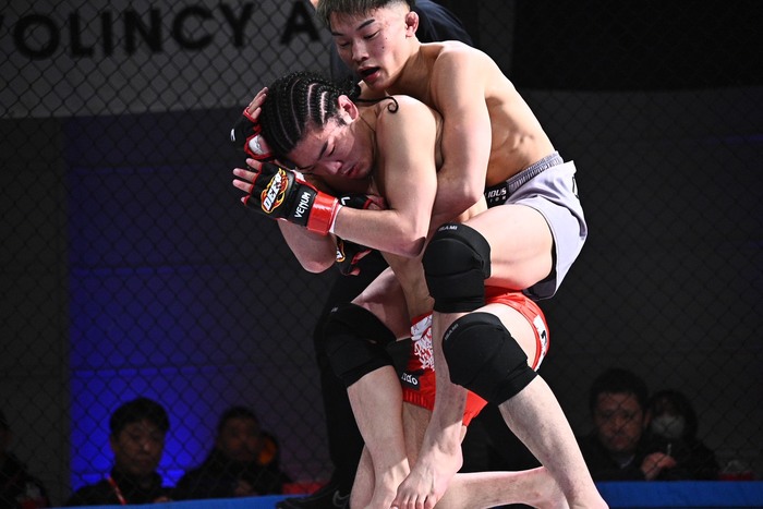 1R、サウスポー構えの佐藤はいきなりシングルレッグで組んで押し込み。突き放す福嶋は右ロー。右を突きて組む佐藤は四つ。ケージ背に福嶋はヒザ。体を入れ替えた福嶋に佐藤は払い腰テイクダウン。しかし下の福嶋は三角絞めへ。佐藤は左拳を入れている。下の福嶋は鉄槌から絞めもゴング。