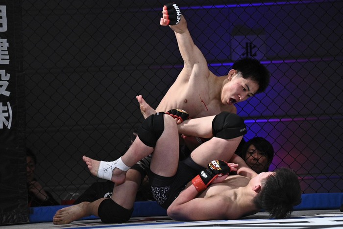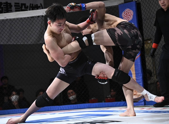 2R、右ローの横山にオーソから左の蹴りの金子はダブルレッグも、潰してトップは横山。立つ金子に横山は右カーフ。しかし、金子はシングルレッグからついにバックへ。ボディトライアングルから立つ横山はグラウンドで正対して上に。立つ横山に金子は左ハイ! さらにシングルレッグからトラックポジションで足関節狙いも横山がボディにパンチでゴング。