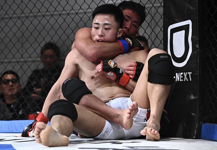 2R、スイッチする竜太に佐藤は前手を当ててシングルレッグも切る竜太がバッククリンチ。片足をかけて崩してバックへ。右手を喉下にかける竜太に正対した佐藤。座る竜太はシングルレッグで持ち上げテイクダウン。立つ佐藤が組むがゴング。