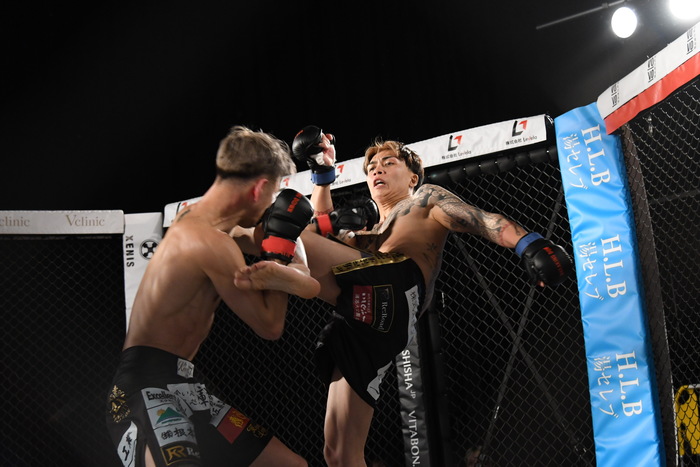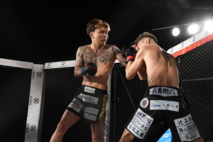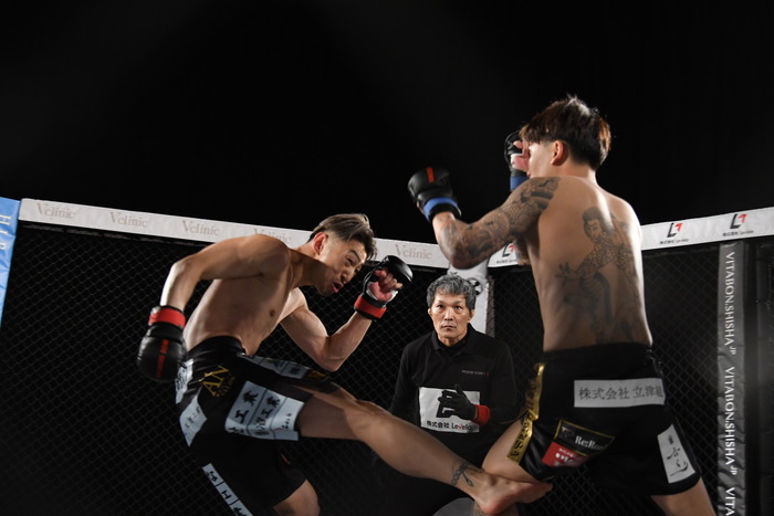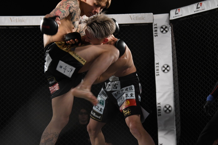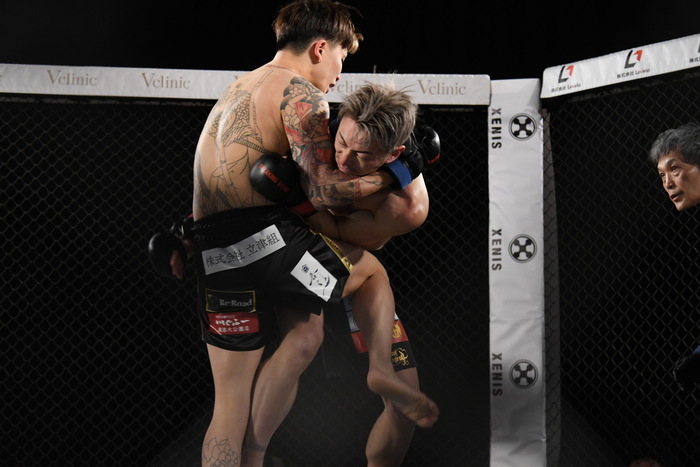 判定はドロー。延長戦へ。右カーフを蹴るカズに龍志は左右フック、カズも左右フックで応戦する。再び飛んでの左ミドルを蹴る龍志。カズの左フックをもらった龍志だが、首相撲からのヒザで逆襲。さらに左右フック、再び首相撲でコントロールしながらのヒザを見舞う。