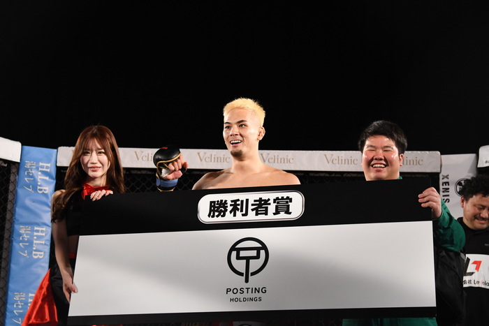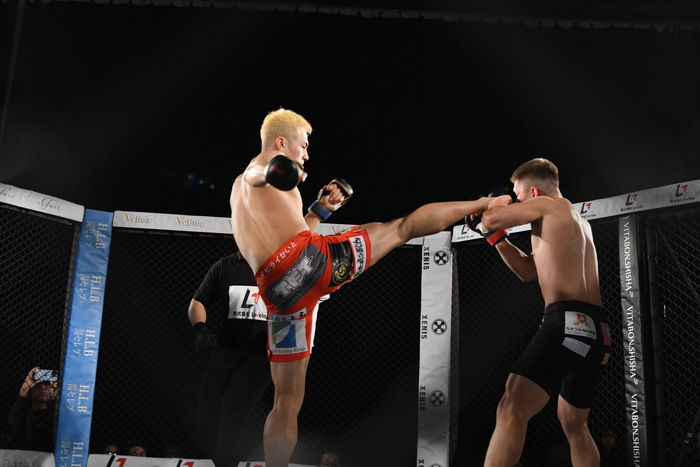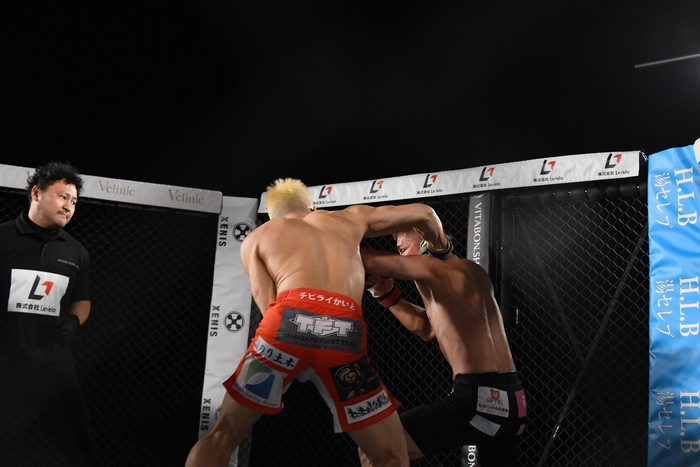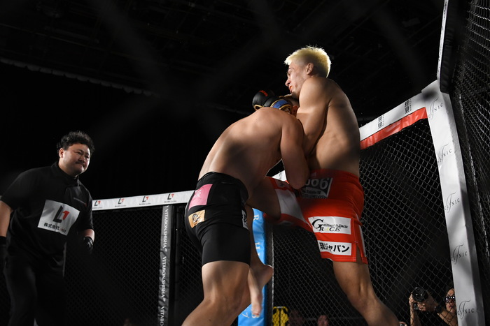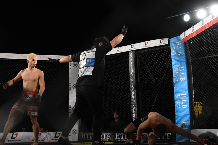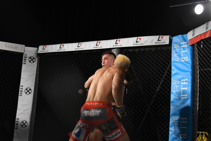 前に出たのは太陽。左右フックから首相撲で組み付く。ブレイク。再び太陽が前に出て左フックで強烈なダウンを奪う。信原は立ち上がることが出来ず、太陽の秒殺KO勝ちとなった。