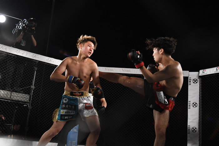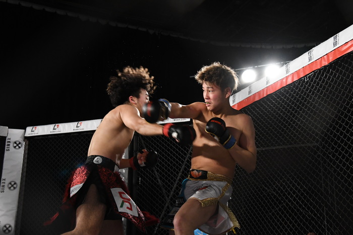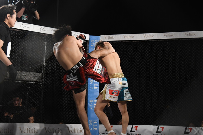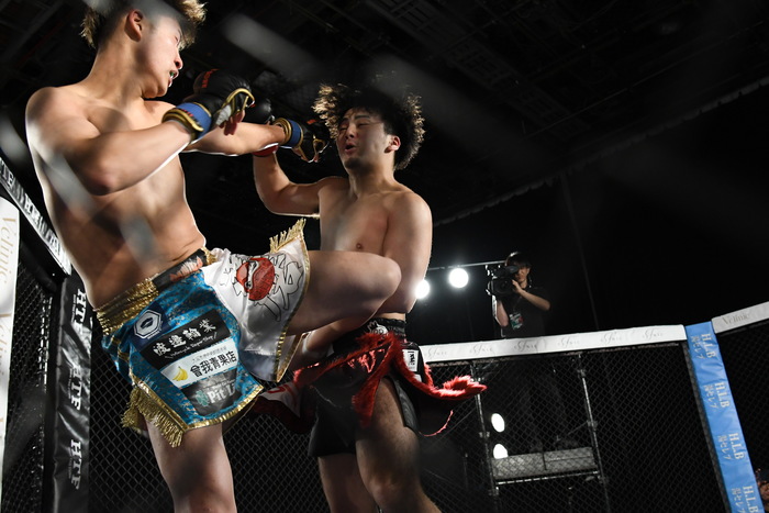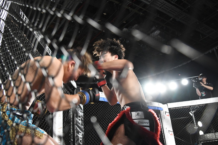 TETSUの左フックに右ストレートを打つ涼太。その涼太の右ストレートにはTETSUが右ハイを合わせる。飛び込んでのワンツー、右ハイを狙うTETSUに涼太も負けじと打ち返す。TETSUは組むとすかさずヒザ蹴り。前に出て攻めの姿勢を見せたのはTETSU。