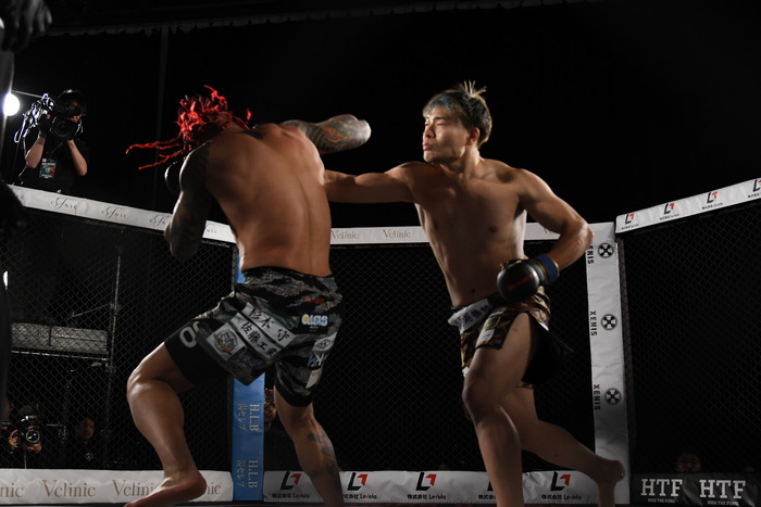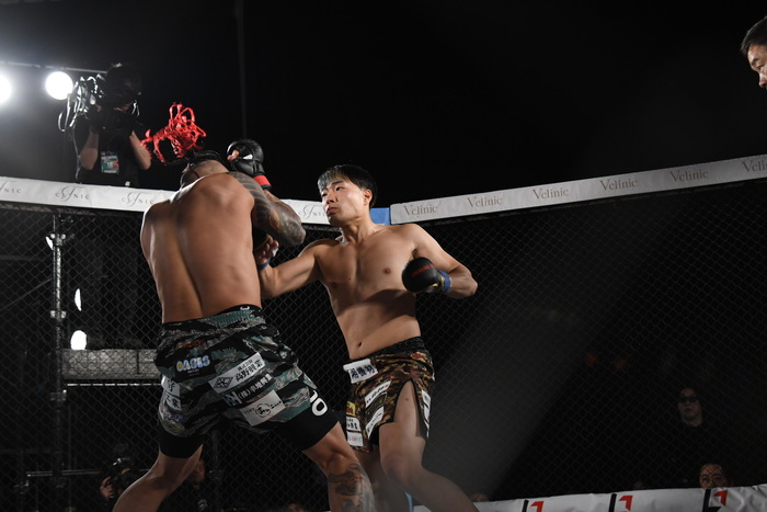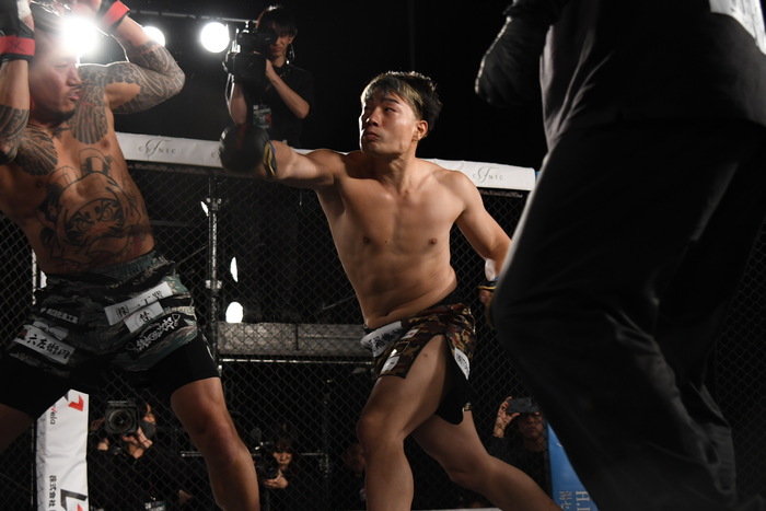 左右フックのモギに沖田は右ストレート。右だけを打ち込んでいく沖田に茂木はローから左右フックを振り回す。ワンツーの連打で前へ出ていく沖田。さらに首相撲に捕まえてのヒザ蹴り。ケージを背負う茂木は左フックをヒットさせたが、沖田の右にバランスを失った。両者ともフルに攻め合った。
