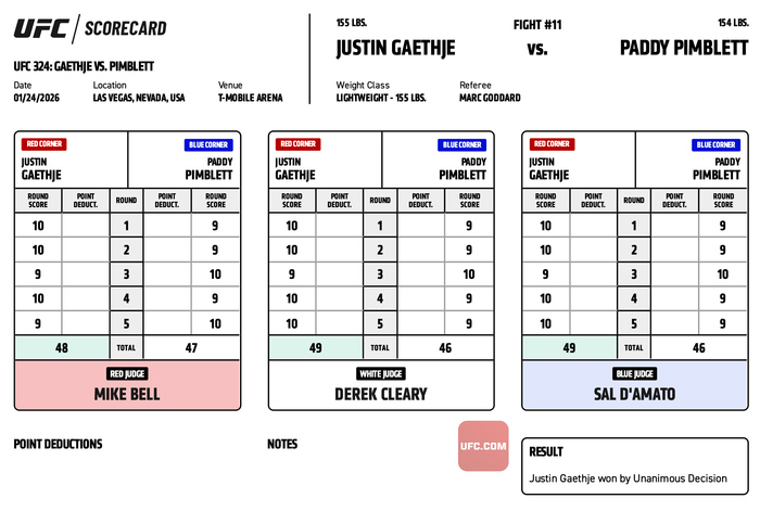 判定3-0(48-47, 49-46×2)でゲイジーが勝利。2度目のライト級暫定王座についた。